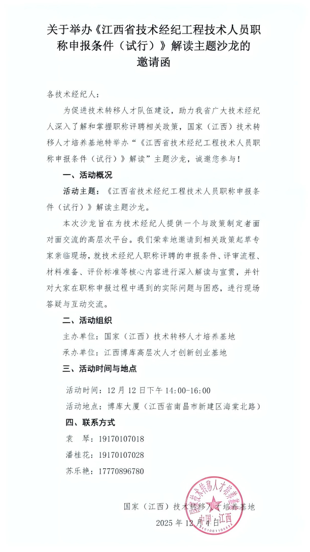 关于举办《江西省技术经纪工程技术人员职称申报条件(试行)》解读主题沙龙的邀请函